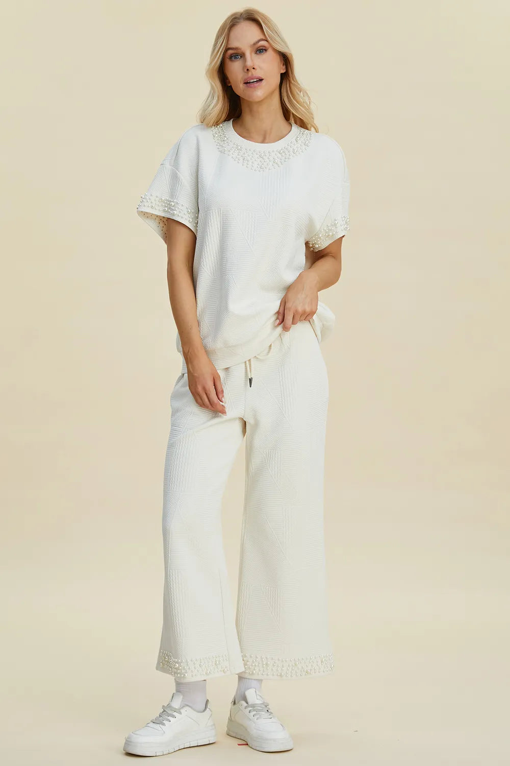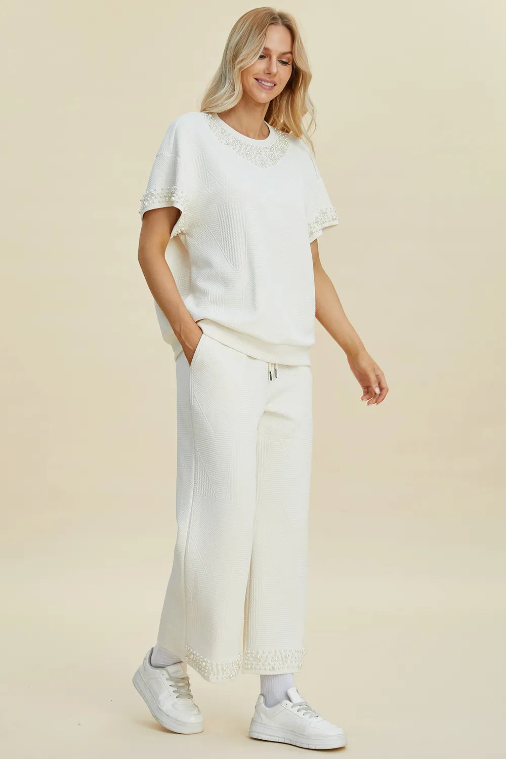 Double Take Full Size Pearl Detail Round Neck Top and Pants Set