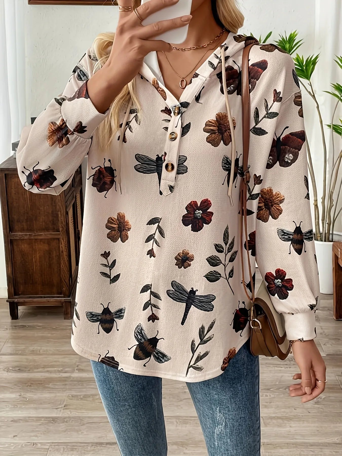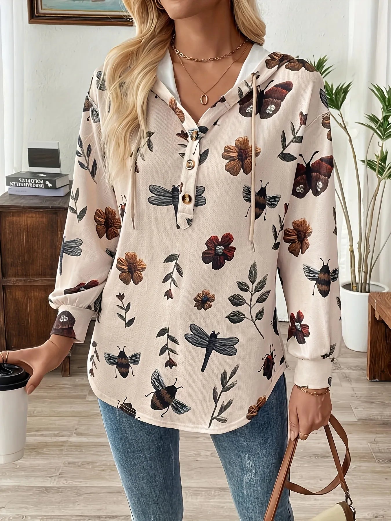 Drawstring Button Front Printed Hoodie